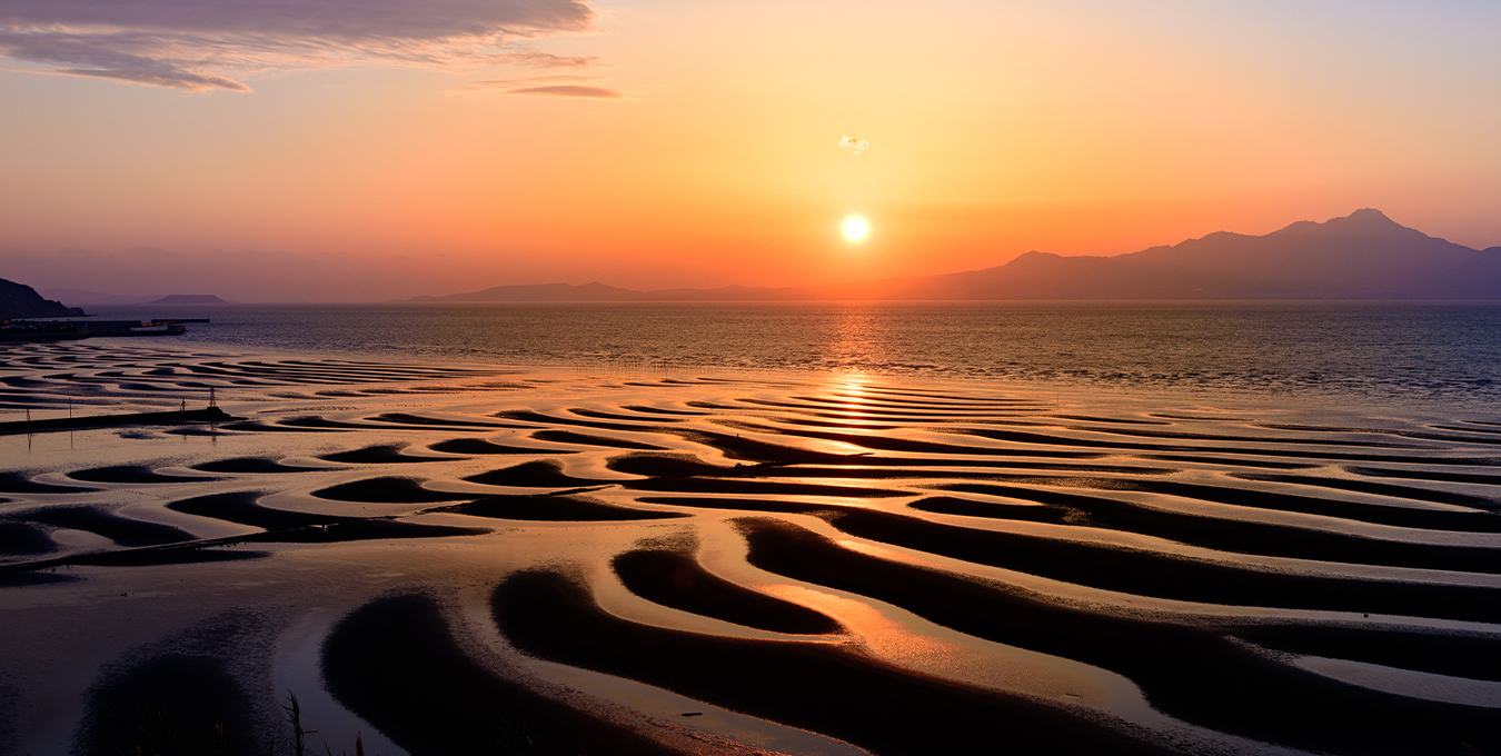 沖合は遠浅の砂浜で、干潮のときは見渡す限りの美しい波模様を見ることができ、有明海の奇勝を形づくっています。御輿来(おこしき)海岸の岩は頁岩と砂岩互層からなり、鬼の洗濯岩のように見えることから「ふとん岩」とも呼ばれています。