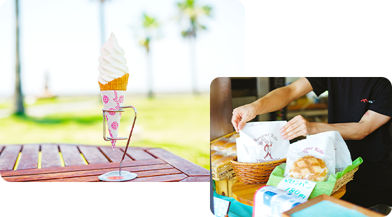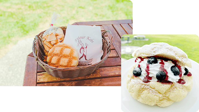 保存料ゼロ、天然素材にこだわった「こだわりメロンパン」や、⽇本で唯⼀!三つ星を受賞した阿部牧場の⽜乳を使⽤した「濃厚絶品ソフトクリーム」などテイクアウトメニューも充実しております!